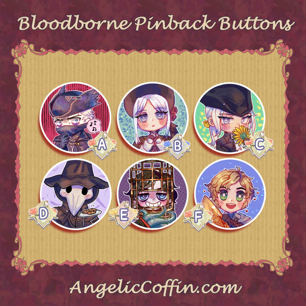 - Round, 1.5″ (3.81cm) pinback buttons of Bloodborne characters