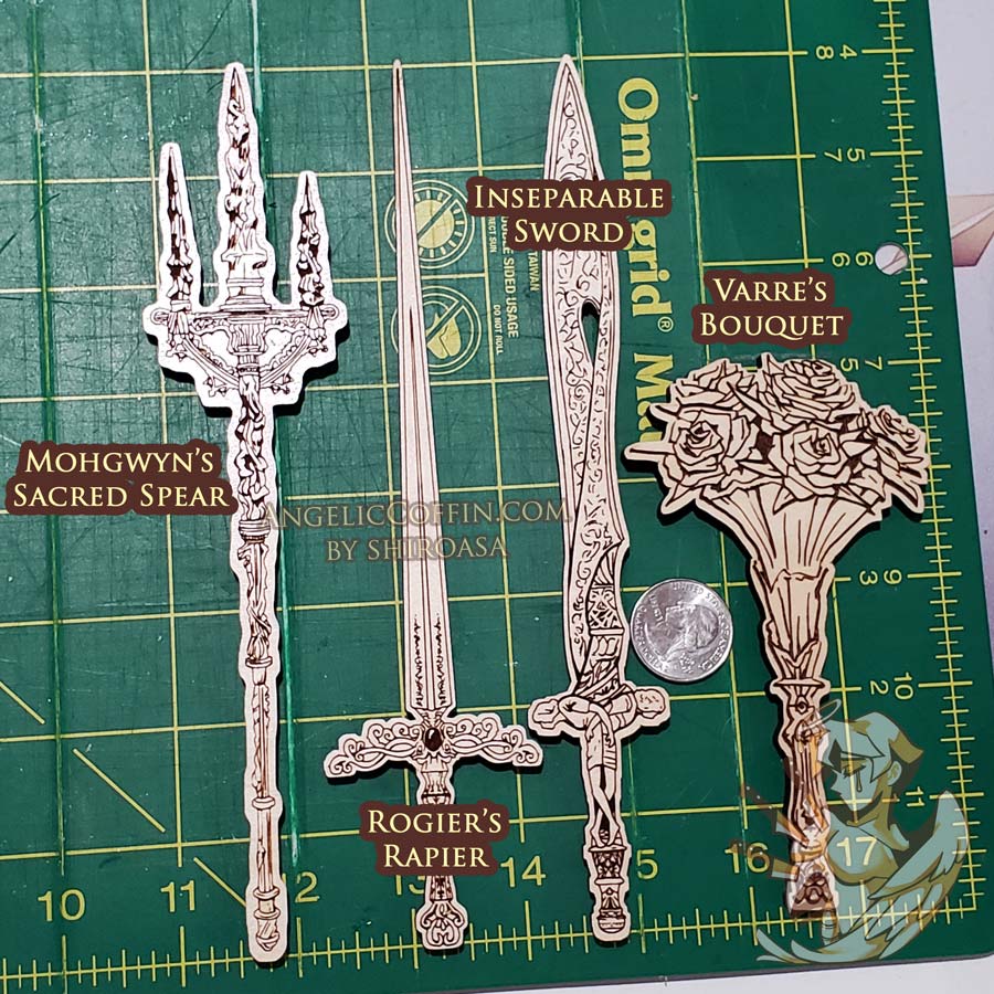 Laser engraved wooden weapons.