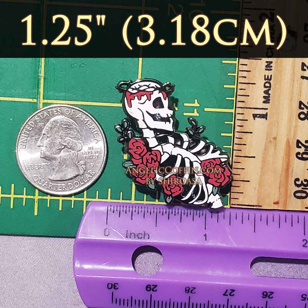 - 1.25โณ (3.175cm) hard enamel pin of a skeleton with roses